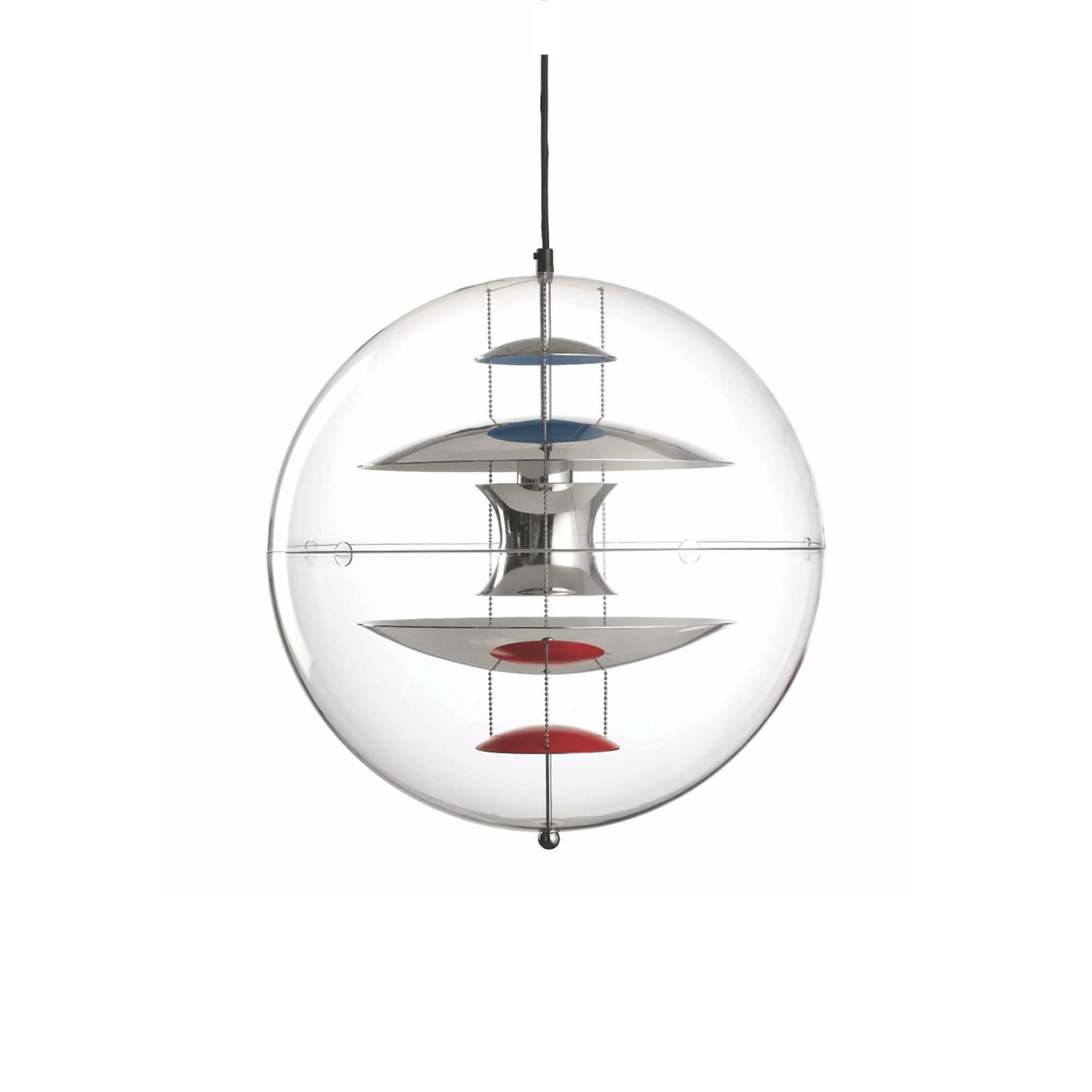 Verner Pantons taklampa VP Globe från Verpan är en pendel tillverkad av genomskinlig akrylplast med fem aluminiumreflektorer lackerade i olika färger, vit, blå och orange. Reflektorerna hänger i tre blanka metallkedjor. De många olika formerna i kombination med samspelet mellan olika material och olika färger skapar en spännande helhet och ett unikt uttryck.