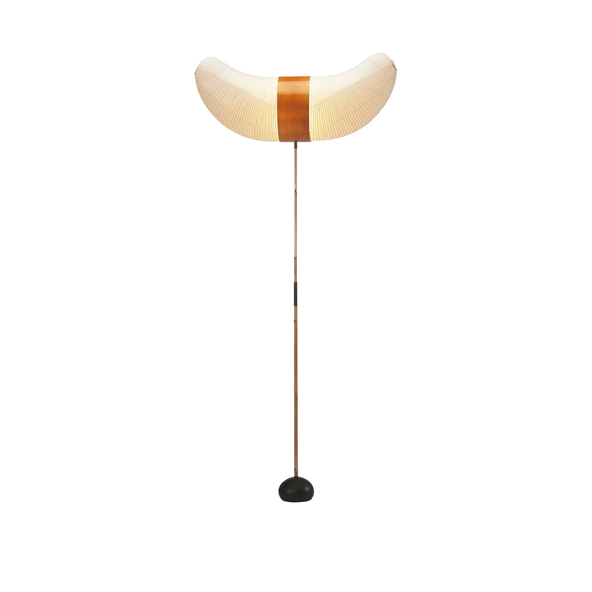 Golvlampan Akari BB3-33S är ett hantverksmässigt alster, skapat av trä och shoji-papper, förstärkt med bambustänger och en fot i svart gjutjärn. Dess unika design bidrar till att göra den till en framträdande och estetiskt tilltalande ljuskälla i vilket utrymme som helst.
