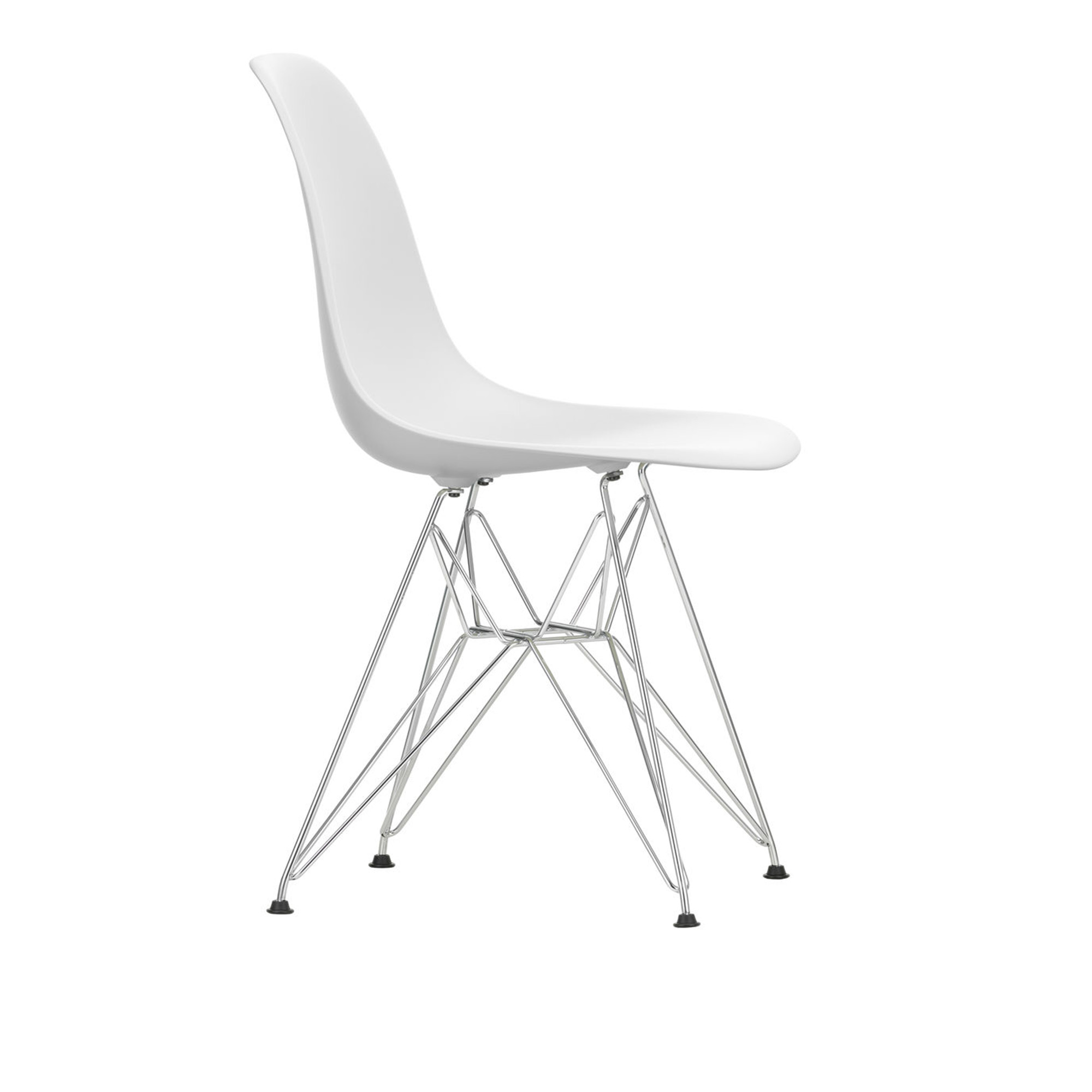 Eames RE Plastic Chair DSR är en ikonisk matstol skapad 1950 av designparet Charles och Ray Eames. Sitsen är fäst vid en unik stålkonstruktion känd som Eiffeltornsbasen, vilken har fyra ben. Sitsen finns tillgänglig i en mängd olika färgval, och benen kan fås i antingen krom eller svart. Charles och Ray Eames introducerade sina mångsidiga Plastic Chairs under Low Cost Furniture Design tävlingen, som ägde rum på Museum of Modern Art i New York under 1950. De avslöjade sina plaststolar med organisk design, som kunde kombineras med olika baser för att skapa stolar med många användningsområden och funktioner. Numera produceras de berömda Eames RE Plastic Chairs av företaget Vitra, som har uppdaterat designen och materialen för att förbättra komforten och kvaliteten. Vitra introducerade tio nya kulörer för Eames RE Plastic Chair år 2019. Sedan 2024 tillverkas skalen på alla Eames Plastic Chair i hundra procent återvunnen plast. Den återvunna plasten härstammar från insamlande av plastförpackningar från tyska hushåll, i insamlingsprogrammet ”Gula påsen”, och är av premiumkvalitet. Att använda återvunnet råmaterial istället för petroleumbaserad primärplast innebär att de klimatskadliga utsläppen minskas rejält, precis som primärenergiförbrukningen. Skalet är naturligtvis återvinningsbart i slutet av sin produktlivslängd.