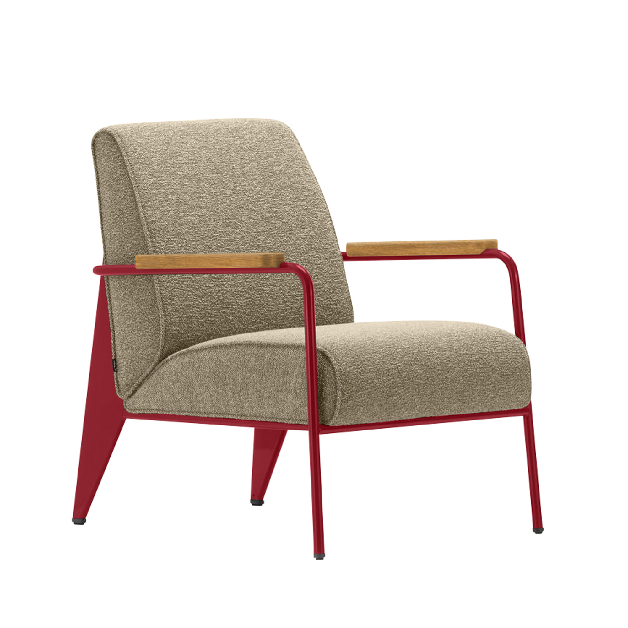 Vitra - Fauteuil de Salon, Base Japanese Red, Natural Oak, Fabric Cat. F100 Nubia Col. 04 Bamboo/Terra - Fåtöljer - Jean Prouvé - Beige - Metall/Trä/Skum