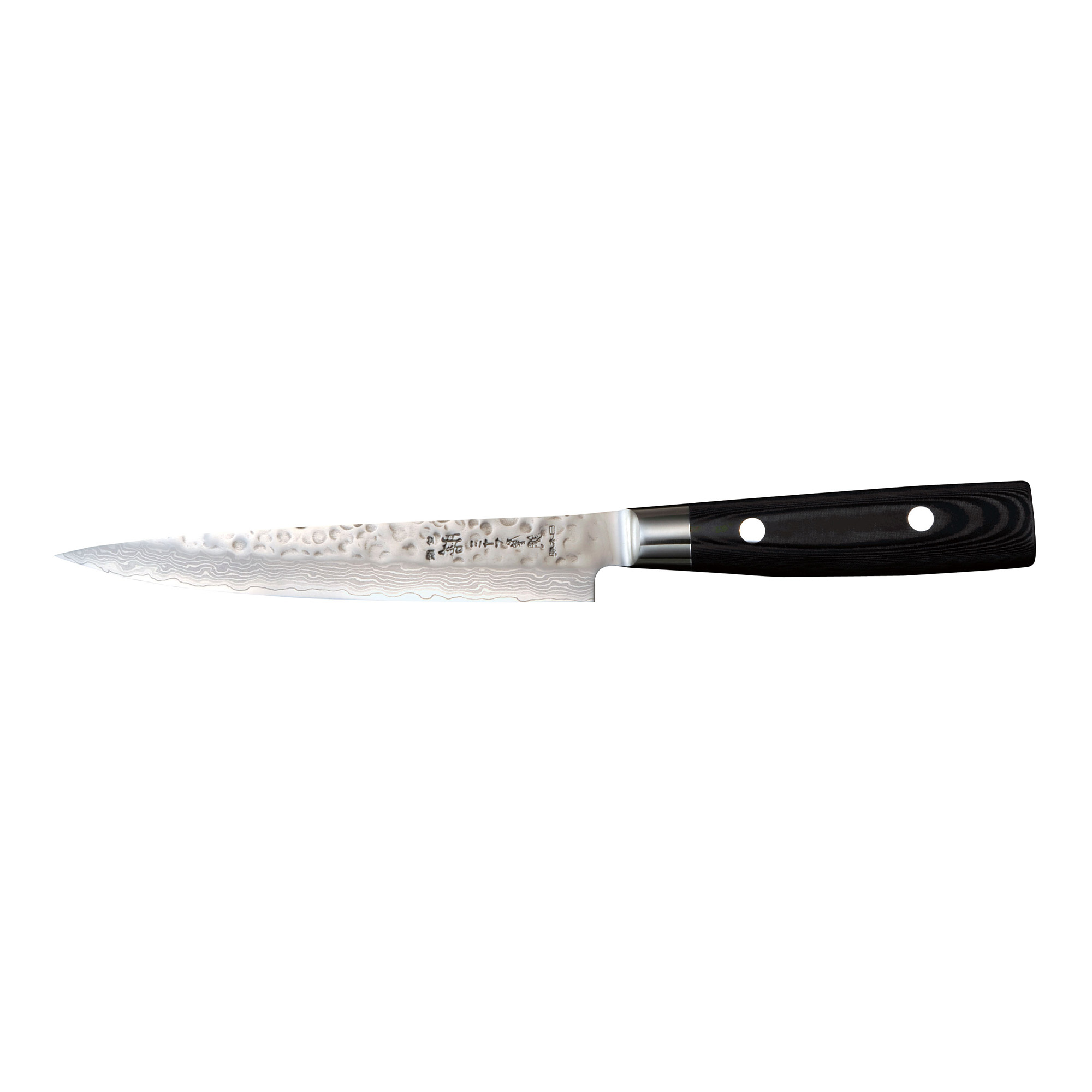 Yaxells Zen Allkniv är det perfekta valet när kockniven känns för stor men skalkniven för liten. Denna mångsidiga kniv kan användas för att enkelt hacka lök, örter, chili, frukt och mindre rotfrukter. Allknivens blad är tillverkat av 37 lager stål, inklusive VG10-stål i kärnan och mjukare stål som ger överlägsen styrka och rostbeständighet. Dessutom ger den handstansade logotypen på den hamrade ytan den här kniven en elegant karaktär. Handtaget är tillverkat av svart micarta som framställs genom att linneduk och specialplast sammanfogats under högt tryck. Det är ett hårt, vattentåligt och hygieniskt material som lämpar sig perfekt för alla köksmiljöer.