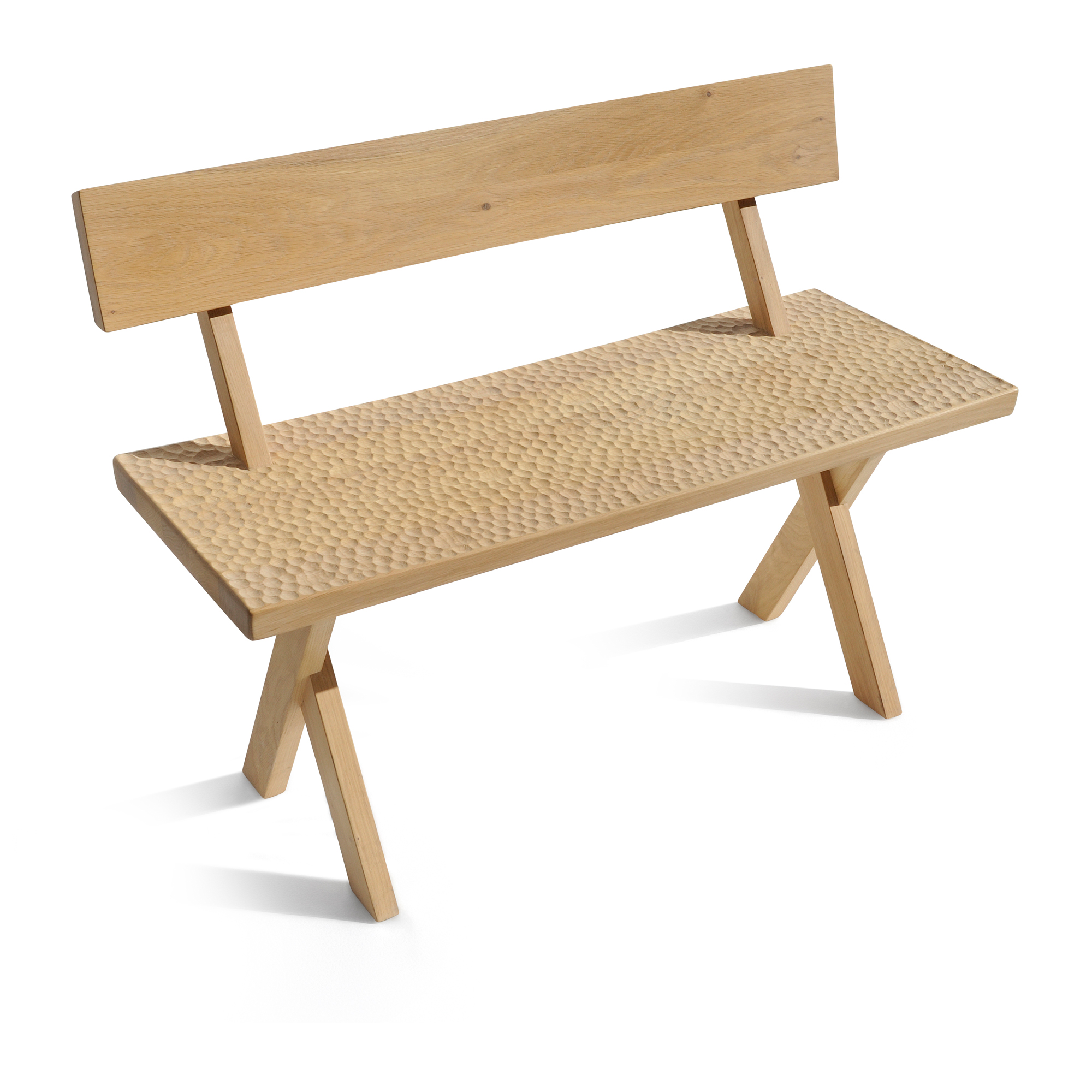 Touch Bench, designad av Studioilse för det bosniska företaget Zanat, är en del av Touch Collection och presenteras här med ett stödjande ryggstöd. Denna bänk har en rektangulär sittyta med ryggstöd som stöds av en enkel bas med en x-formad struktur. Varje bänk är handgjord i massivt trä och kunderna kan välja mellan olika träsorter och ytbehandlingar. Det finns även möjlighet att beställa bänken utan ryggstöd. Sitsens handkarvade, texturerade yta bidrar till Touch-seriens distinkta estetik. Med två olika höjder är bänken mångsidig och kan användas som en ytterligare avställningsplats eller sittmöbel i utrymmen som hallen, köket eller vardagsrummet. Touch Collection är framtagen med en unik teknik där träytan bearbetas manuellt för att skapa en gropig textur, vilket lockar till beröring och interaktion med möbeln. Designkonceptet syftar till att skapa en analog koppling till vår omgivning i en tid som präglas av digitalisering. Tack vare det unika hantverket blir varje möbel inom Touch Collection ett unikt exemplar.
